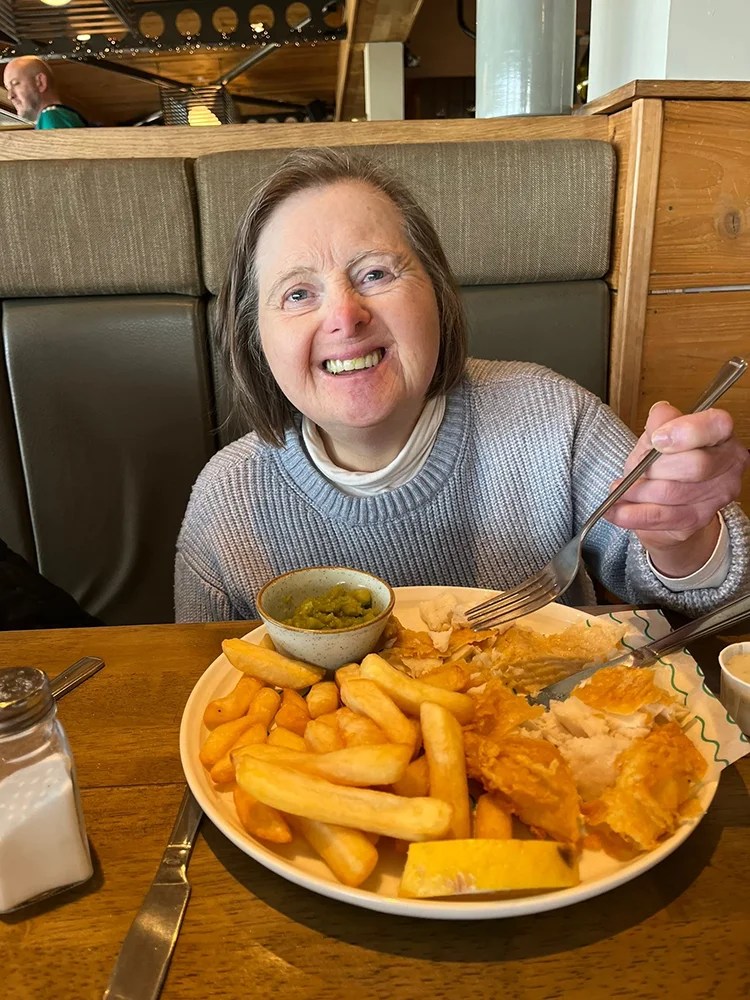 During her stay, Sarah took part in a variety of activities, including walks along the beach, swimming, painting, and enjoying the evening entertainment. One of her favourite treats was tucking into some delicious fish and chips, followed by cosy nights relaxing on the couch.